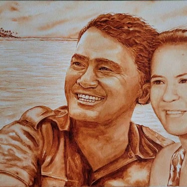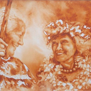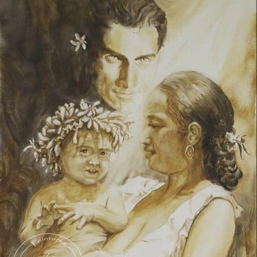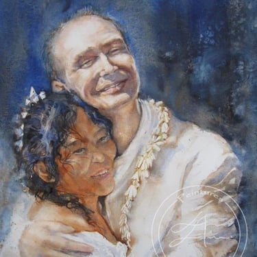 Teiri et Timi, deux amoureux aux Tuamotu en 1970 Aquarelle (100%coton - 56 cm X 36 cm) 2023