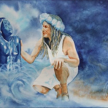 Bobby et sa statuette d'Hina au Pomare Show de 1988 Aquarelle (100%coton - 56 cm X 36 cm) 2020