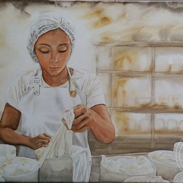 " La tresseuse de pandanus devant sa machine à laver..." Aquarelle (100%coton - 56 cm X 36 cm) 2021