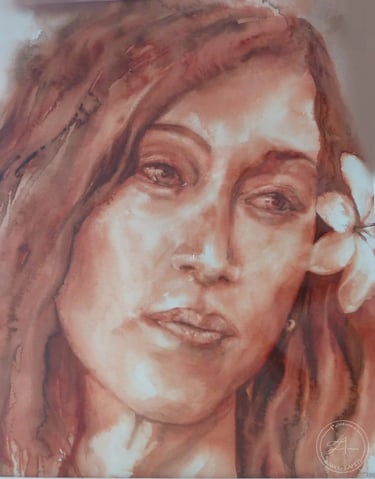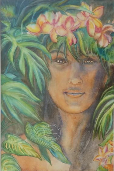 "Teiri et Timi, aux Tuamotu, années 70" Aquarelle (56 cm x 36 cm) 2023