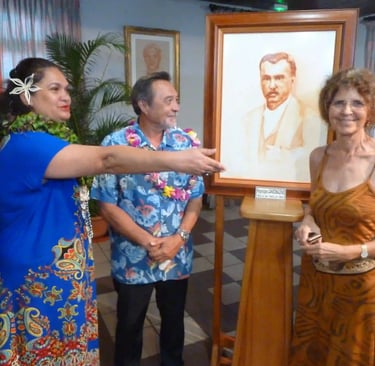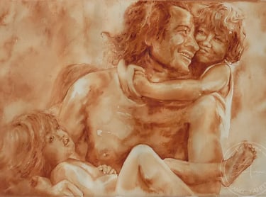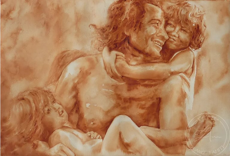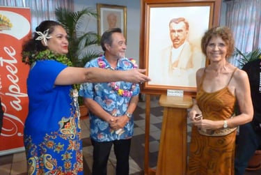 " Henri Hiro et ses enfants..." Aquarelle 76 cm X 56 cm. Réalisée pour la commémoration des 20 ans de sa disparition. Exposition au Musée de Tahiti et des îles, 2010