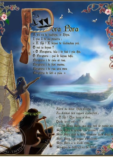 " Hina et Ru' découvrent Bora Bora..." Enluminure or 22 ct, & acrylique sur toile 60 cm X 45 cm, Exposition "Enluminures polynésiennes", Galerie Au Chevalet, 2021