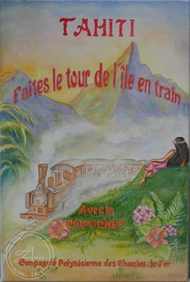 Et pourquoi ne pas rêver d'un train à Tahiti ? Aquarelle 2017 (100%coton - 56 cm X 36 cm)