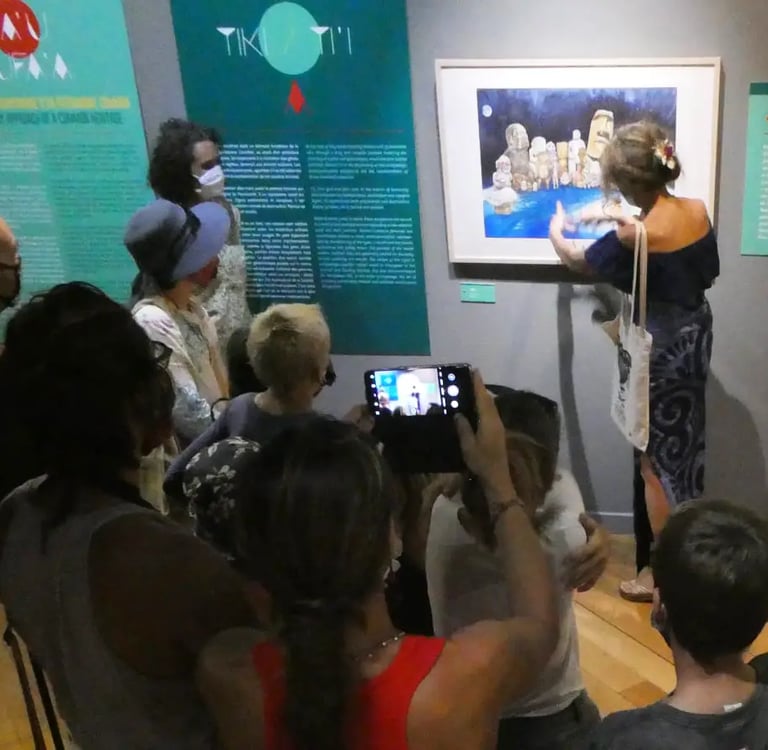 " Hina et Ru' découvrent Bora Bora..." Enluminure or 22 ct, & acrylique sur toile 60 cm X 45 cm, Exposition "Enluminures polynésiennes", Galerie Au Chevalet, 2021